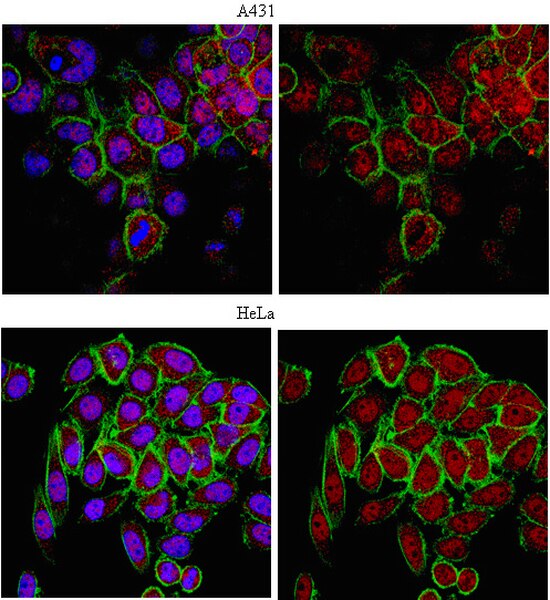 Immunocytochemistry Analysis: 1:500 dilution from a representative lot detected ERR-alpha in A431 and HeLa cells.