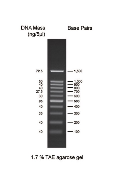 DirectLoad™ Plus 100bp DNA Ladder contains 11 fragments, which are obtained from PCR products and double-stranded DNA digested with appropriate restriction enzymes equilibrated to 10 mM Tris-HCl (pH 8.0) and 10 mM EDTA after phenol extraction. The DNA includes fragments ranging from 100-1,500 base pairs. The 500 and 1,500 base pair bands have increased intensity to serve as reference points.