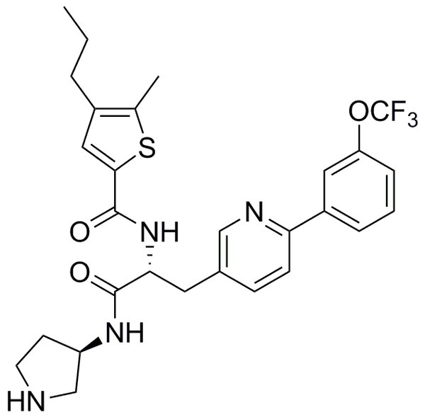 More>> A cell-permeable, potent and selective inhibitor of MT-bound KIFC1 motor domain ATPase activity. Targets centrosome-amplified tumor cells, causes mitotic delay & multipolar spindle formation. Less<<Synonyms: 5-Methyl-N-((R)-1-oxo-1-((R)-pyrrolidin-3-ylamino)-3-(6-(3-(trifluoromethoxy)phenyl)pyridin-3-yl)propan-2-yl)-4-propylthiophene-2-carboxamide, Tctex7 Inhibitor, Knsl2 Inhibitor, MT/KIFC1 Inhibitor, Bm4137 Inhibitor, HSET Inhibitor, Kinesin Family Member C1 Inhibitor