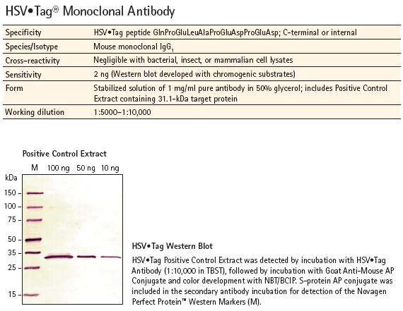 The HSV•Tag® Antibody is a mouse monoclonal antibody (IgG1) that has high specificity and affinity for an 11-amino acid peptide derived from Herpes Simplex Virus (HSV) glycoprotein D. The peptide is encoded by the HSV•Tag sequence in appropriate expression vectors and by the Positive Control 36mer in the Novagen NovaTope® System. The purified antibody produces a strong signal at a 1:10,000 dilution on Western blots (Sakai 1996), dot blots, and colony lifts when used with the Novagen Anti-Mouse IgG AP Conjugate.