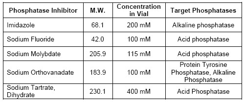 A cocktail of five phosphatase inhibitors for the inhibition of acid and alkaline phosphatases as well as protein tyrosine phosphatases (PTPs). Suitable for use with cell lysates and tissue extracts, including samples containing detergents. Provided as a set of five 1 ml vials containing the following components: Imidazole (200 mM), Sodium Fluoride (100 mM), Sodium Molybdate (115 mM), Sodium Orthovanadate (100 mM), and Sodium Tartrate Dihydrate (400 mM).