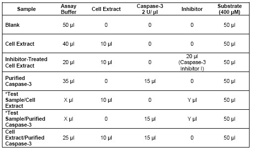 Kit contains | Human Recombinant Caspase-3, Cell Lysis Buffer, a DEVD-pNA Colorimetric Substrate, Ac-DEVD-AMC Fluorometric Substrate, Calibration Standard (p-Nitroaniline), AMC Calibration Standard, an Inhibitor, Assay Buffer, one half-volume 96-Well Plate, and a user protocol. |