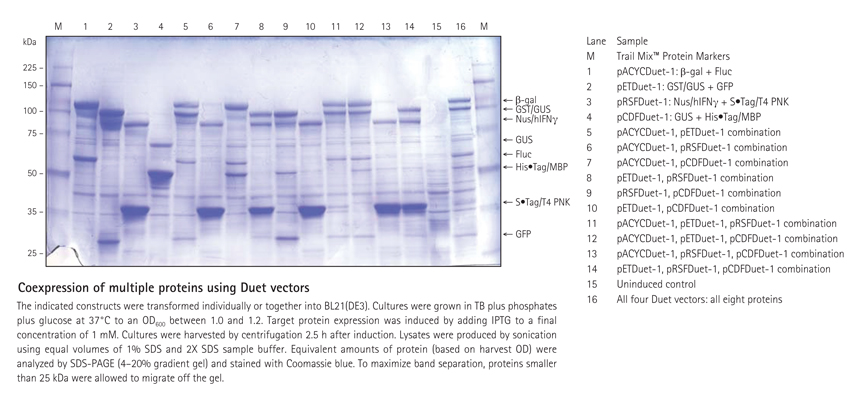 Application Data | ![]() ![]() LaneM: Trail Mix™ Protein Markers; Lane1: pACYDuet-1:β-gal + Fluc; Lane2: pETDuet-1:GST/GUS + GFP; Lane3: pRSFDuet-1:Nus/hlFNγ + S•Tag/T4 PNK; Lane4: pCDFDuet-1:GUS + His•Tag/MBP; Lane5: pACYDuet-1, pETDuet-1 combination; Lane6: pACYDuet-1, pRSFDuet-1 combination; Lane7: pACYDuet-1, pCDFDuet-1 combination; Lane8: pETDuet-1, pRSFDuet-1 combination; Lane9: pRSFDuet-1, pCDFDuet-1 combination; Lane10: pETDuet-1, pCDFDuet-1 combination; Lane11: pACYDuet-1, pETDuet-1, pRSFDuet-1 combination; Lane12: pACYDuet-1, pETDuet-1, pCDFDuet-1 combination; Lane13: pACYDuet-1, pRSFDuet-1, pCDFDuet-1 combination; Lane14: pETDuet-1, pRSFDuet-1, pCDFDuet-1 combination; Lane15: Uninduced control; Lane16: All four Duet vectors: all eight proteins The indicated constructs were transformed individually or together into BL21(DE3). Cultures were grown in TB plus phosphates plus glucose at 37°C to and Abs600 between 1.0 and 1.2. Target protein expression was induced by adding IPTG to a final concentration of 1 mM. Cultures were harvested by centrifugation 2.5 h after induction. Lysates were produced by sonication using equal volumes of 1% SDS and 2X SDS sample buffer. Equivalent amounts of protein (based on harvest ABS) were analyzed by SDS-PAGE (4-20% gradient gel) and stained with coomassie blue. To maximize band separation, proteins smaller than 25 kDa were allowed to migrate off the gel. |