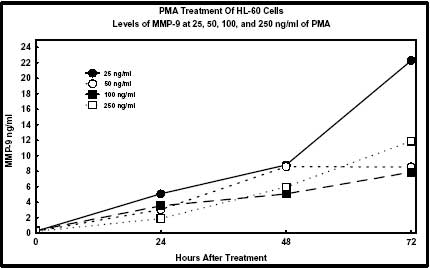 It has been shown that the induction of MMP-9 gene expression is associated with macrophage differentiation. Phorbol 12-myristate 13-acetate (PMA) at all concentrations studied induced the synthesis of MMP-9 protein. This up regulation closely parallels the timing of PMA induced cell adhesion and spreading, a hallmark of macrophage differentiation.