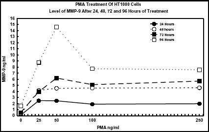 PMA has been shown to increase the expression of MMP-9 by HT1080 cells. The MMP-9 ELISA detects this increase in synthesis in a time dependent matter.