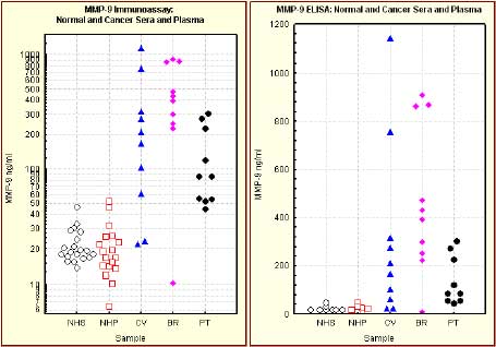 Levels of MMP-9 detected by the assay are significantly elevated in cancer sera samples compared to normal sera and plasma samples (left figure is the data on a logarithmic scale and the right is a linear scale). The following samples were assayed: normal human sera (NHS), normal human plasma (NHP), sera from cervical cancer (CV), breast cancer (BR) and prostate cancer (PT) patients.