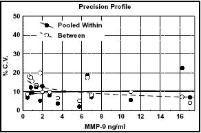 The pooled coefficients of variation (according to the formula of Henry et. al., 1974) and between assay coefficients of variation are plotted against MMP-9 concentrations. The pooled data were collected from samples run eight times using two different lots of plates and two different lots of detector antibody in replicates of four on two separate occasions.