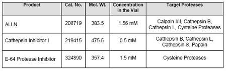 Overview | A cocktail of three protease inhibitors with selective specificity for the inhibition of cysteine proteases, including calpains, cathepsins, and papain. Each vial contains 1.56 mM ALLN (Cat. No. 208719), 1.5 mM E64 Protease Inhibitor (Cat. No. 324890), and 0.5 mM Cathepsin Inhibitor I (Cat. No. 219415). Supplied with a data sheet. Note: 1 set = 5 x 1 ml. |