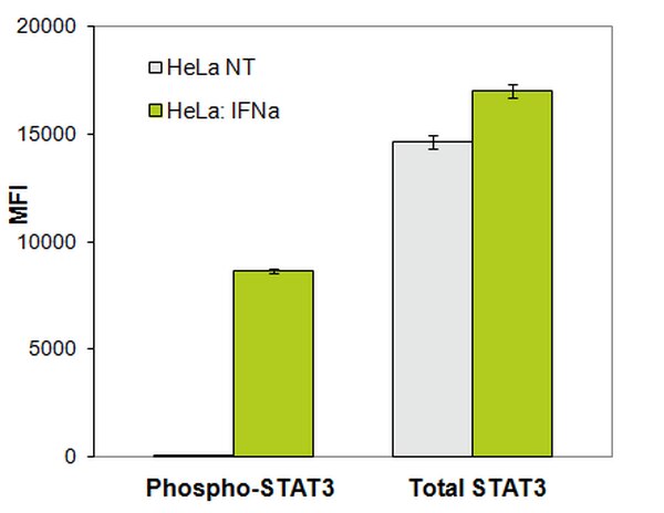 Protein phosphorylation represents the major mechanism used in regulating cellular functions in all eukaryotic cells. Aberrant phosphorylation has been implicated in the onset and development of many diseases including metabolic disorders, inflammatory disease, cancer, etc. Changes in protein phosphorylation can be attributed to both changes in phosphorylation events as well as changes due to total protein levels. In order to distinguish the changes in phosphorylation from changes in protein expression, it is important to normalize the signal from phosphorylation over the signal from total protein. For this need, the MILLIPLEX MAP 2-plex Phospho/Total STAT3 Kit (Cat. No. 48-623MAG) has been developed for the simultaneous detection of phosphorylated STAT3 (Tyr705) and total STAT3 in a single well using the Luminex system.