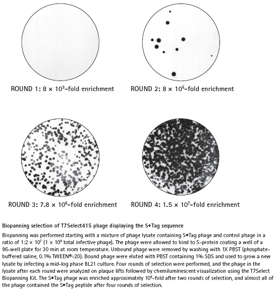| Overview | Enrichment of T7 phage displaying target peptides or proteins can easily be accomplished with the T7Select® Biopanning Kit. The kit contains reagents to perform biopanning with target ligands using 96-well microtiter plates or similar solid phases. Biopanning procedures can be tested and optimized using the positive and negative controls provided in the kit. The supplied Positive Control Lysate contains a T7Select415-1 recombinant that displays the S•Tag™ peptide. When combined with the Negative Control Lysate at known ratios, the degree of enrichment of high affinity binding phage can be monitored by a simple plaque lift assay with the provided detection reagents. Biopanning selectionBiopanning requires both binding and elution conditions that maintain the infectivity of the phage. The stability of the T7 phage particle enables the use of a variety of elution conditions during biopanning. Phage maintain infectivity following treatment with 1% SDS, 5 M NaCl, 4 M urea, 2 M guanidine-HCl, 10 mM EDTA, reducing conditions (up to 100 mM DTT), and a pH range of 4 to 10. The wide range of conditions available for T7Select biopanning expands the range of targets that can be used successfully.