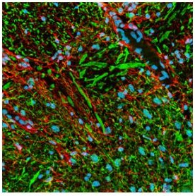 Detection of phosphorylated rat neurofilament H by staining frozen sections. Sample: Rat brain. Primary antibody: PhosphoDetect™ Anti-Neurofilament-H Mouse mAb (SMI-31) (Cat. No. NE1022) (1:1000). Detection: fluorescence (green) with Hoechst 33342 counterstain.