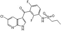 More>> The Raf Kinase Inhibitor V, also referenced under CAS 918505-84-7, controls the biological activity of Raf Kinase. This small molecule/inhibitor is primarily used for Phosphorylation & Dephosphorylation applications. Less<<Synonyms: Propane-1-sulfonic acid-(3-(5-chloro-1H-pyrrolo[2,3-b]pyridine-3-carbonyl)-2,4-difluoro-phenyl)-amide, PLX4720