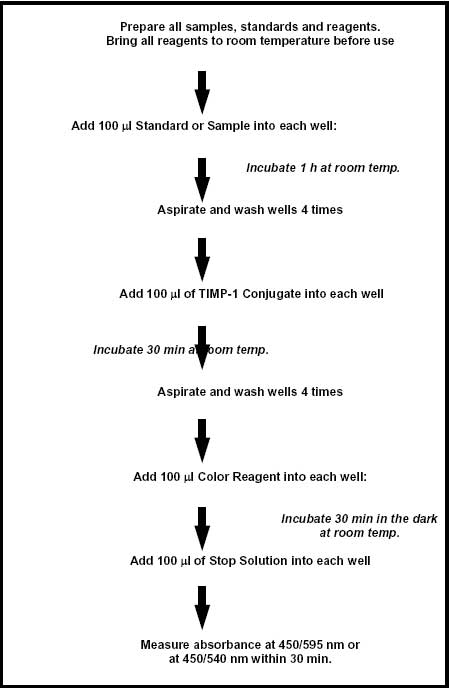 | Kit contains | 96-Well Coated Plate, Human TIMP-1 Standard, Detector Antibody, Assay Buffers, Color Reagent, Stop Solution, Plate Cover, and a user protocol. |