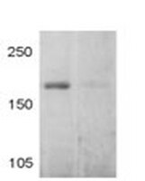 Detection of mouse early endosomal antigen 1 by immunoblotting. Samples: Whole tissue extract from mouse brain left untreated (lane 1) and treated with neutralizing peptide (lane 2). Primary antibody: Anti-Early Endosomal Antigen 1 (1391-1410) Rabbit pAb (Cat. No. 324610) (1 µg/ml). Detection: chemiluminescence.