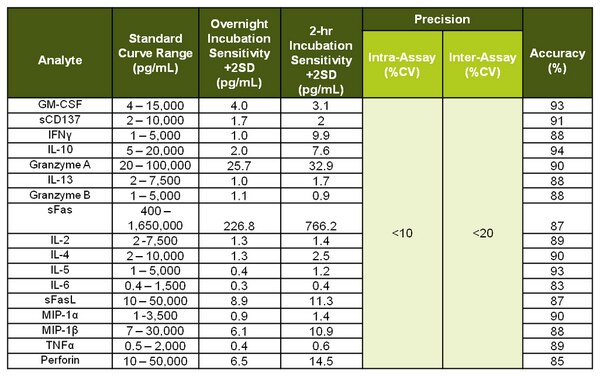 | GM-CSF sCD137 IFNγ sFas sFasL Granzyme A Granzyme B IL-2 IL-4 IL-5 IL-6 IL-10 IL-13 MIP-1α MIP-1β TNF-α Perforin | H | Mplex | Luminex xMAP |