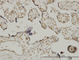 Detection of human EVT6 by immunoblotting. Sample: Whole cell lysate from Jurkat cells. Primary antibody: Anti-ETV6 Mouse mAb (3B10) (Cat. No. DR1093) (1-5 µg/ml). Detection: chemilimunescence. Detection of human EVT6 by staining paraffin sections. Sample: Formalin-fixed, paraffin-embedded human placenta tissue. Primary antibody: Anti-ETV6 Mouse mAb (3B10) (Cat. No. DR1093) (3 µg/ml). Detection: colorimetric (DAB).