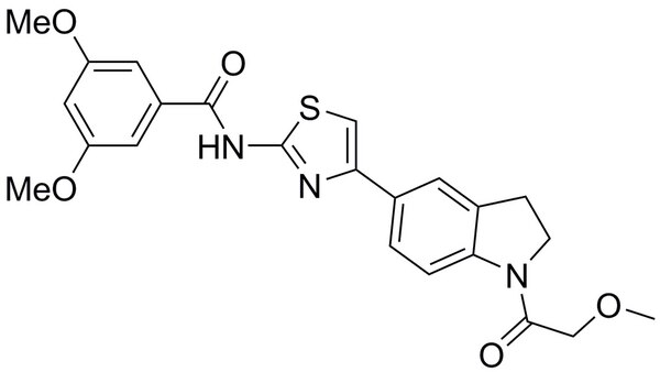 A cell-permeable, non-toxic, indolinyl-thiazole based compound that acts as a highly potent, reversible inhibitor of lipid uptake via scavenger receptor class B type I (SR-BI; IC50 = 6 nM). Shown to block the uptake of [3H] labeled cholesteryl oleate ester ([3H]CE) from [3H]CE-HDL (IC50 = 7 nM). Exhibits high selectivity when tested against a panel of 67 different receptors and secondary targets (at 10 µM). Displays excellent stability in human plasma (99% remaining after 5 h, with 94% plasma protein bound) and mouse liver microsomes (75% remaining after 1 h).