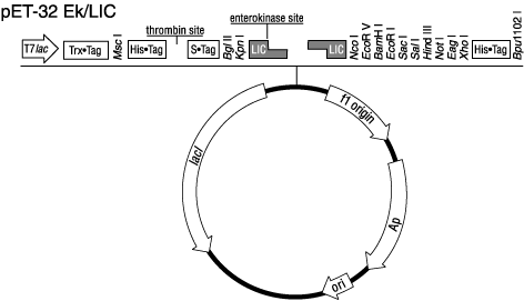 Overview | The pET-32 Ek/LIC vector is an Ek/LIC version of pET-32b(+). It is designed for cloning and high-level expression of target proteins fused with the 109aa Trx•Tag™ thioredoxin protein, and His•Tag® and S®Tag™ coding sequences that are cleavable with enterokinase (Ek) protease. The plasmid contains a strong T7lac promoter, an optimized RBS, the coding sequence for the Ek protease cleavage site (AspAspAspAspLys↓), and a multiple cloning site that contains restriction enzyme sites found in many other Novagen expression vectors to facilitate insert transfer. An optional C-terminal His•Tag coding sequence is compatible with purification, detection, and quantification.