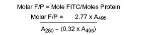 2. Using the two absorbance readings, calculate the F/P molar ratio of the FITC/Protein conjugate using the following equation: