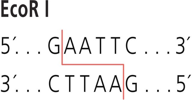 EcoRI is a restriction endonuclease that is used in molecular biology applications to cleave DNA at the recognition site 5′-G/AATTC-3′, generating fragments with 5′-cohesive termini.