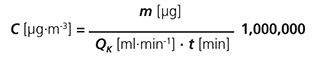 The listed sampling rate values already take into account for the desorption efficiency with carbon disulfide. The average concentration over the exposure time interval is therefore calculated from the mass of analyte found onto the cartridge and exposure time without introducing any corrective factor, apart from corrections due to average temperature different from 25 °C.