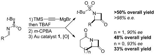 Ye L, He W, Zhang L. 2011. A Flexible and Stereoselective Synthesis of Azetidin-3-ones through Gold-Catalyzed Intermolecular Oxidation of Alkynes. Angew.Chem. Int. Ed.. 50(14):3236-3239. https://doi.org/10.1002/anie.201007624