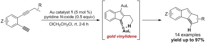 - ジインから1,2-ジヒドロシクロペンタ[a]インデンが得られ、新規な金-ビニリデン種の関与が示唆されました。2IPrAuNTf2のような他の触媒にくらべ収率が著しく向上しています。