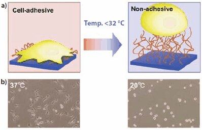 図1(a)ポリ(N-イソプロピルアクリルアミド) グラフト表面への細胞の接着(37℃)と脱着(20℃)を示す概略図。細胞の回収は、温度を下げるだけで行うことができます。(b)37℃と20℃における、PNIPAMをコーティングした培養皿上の内皮細胞の顕微鏡写真。左の写真に見られる伸張した細胞形状は基材表面に接着している特徴を示し、右の写真で見られる丸みのある細胞形状は溶液中の遊離した細胞の特徴を示しています。
