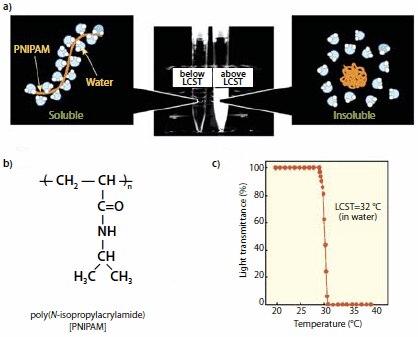 図2ポリ(N-イソプロピルアクリルアミド)(PNIPAM)水溶液の温度応答性。(a)LCST以上に加熱すると、水和して伸張していたPNIPAM鎖は結合している水分子を放出しながら疎水性のグロビュール状態へと変化します。(b)PNIPAMの化学構造。(c)温度の関数としてプロットしたPNIPAM水溶液の溶液透過率。LCSTは転移曲線の中点に対応します。