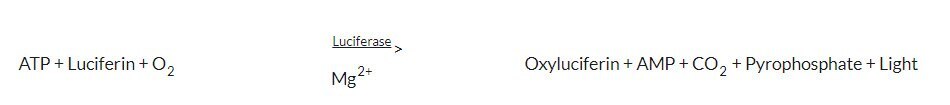 In a 0.051 ml reaction mix, the final concentrations are 0.15 mM Luciferin, 49 mM glycine, 0.98 mM Tris, 7 mM magnesium sulfate, 0.7 mM EDTA, 0.1% (w/v) BSA, 0.1% (w/v) Sodium Azide, 100 nM ATP, and 3,000 – 4,000 units Luciferase.