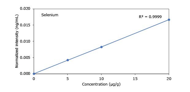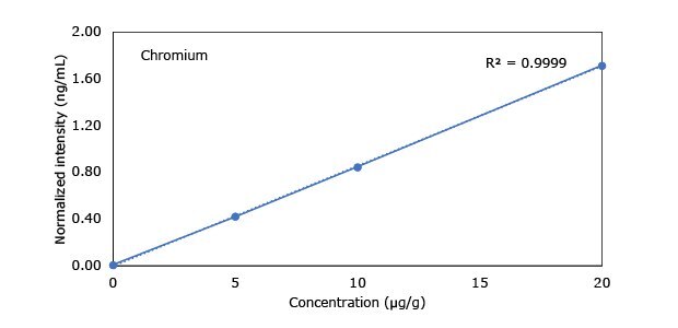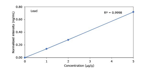 To compensate for the sample matrix effects, a standard addition approach utilizing a certified reference material (CRM) Heavy Metal Mix IX standard solution and various ICP single element standards was applied for the preparation of all calibration curves. The final calibration curve was comprised of four data points (three standard addition solutions plus sample solution).