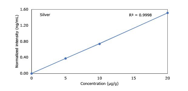 Standard addition solutions were prepared utilizing Heavy Metal Mix IX standard solution (As, Cd, Hg, Pb) and eight ICP single element standard solutions (Ag, Ba, Cr, Cu, Co, Ni, Sb, Se, Zn). Shown are the results obtained for the chocolate cookie sample. These revealed excellent linearity over the entire calibration range, with r2 values of > 0.9997 for all but arsenic (0.9922). The latter can be considered uncritical, as all analysis results are below 0.1 µg/g and corresponding recovery rates are excellent (see next chapter). Comparable results were achieved with all other hemp containing food samples. Shown in Figure 2 are the results obtained for the chocolate cookie sample.