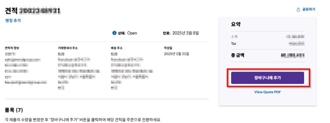 1. 배송주소, 수령인, 거래명세서 및 세금계산서 발행주소를 확인한 후 견적 및 주문진행을 클릭합니다. 하기 등록된 정보를 변경하시고자 한다면 홈페이지가 아닌 고객정보 변경 요청서를 작성하여 제출 바랍니다.