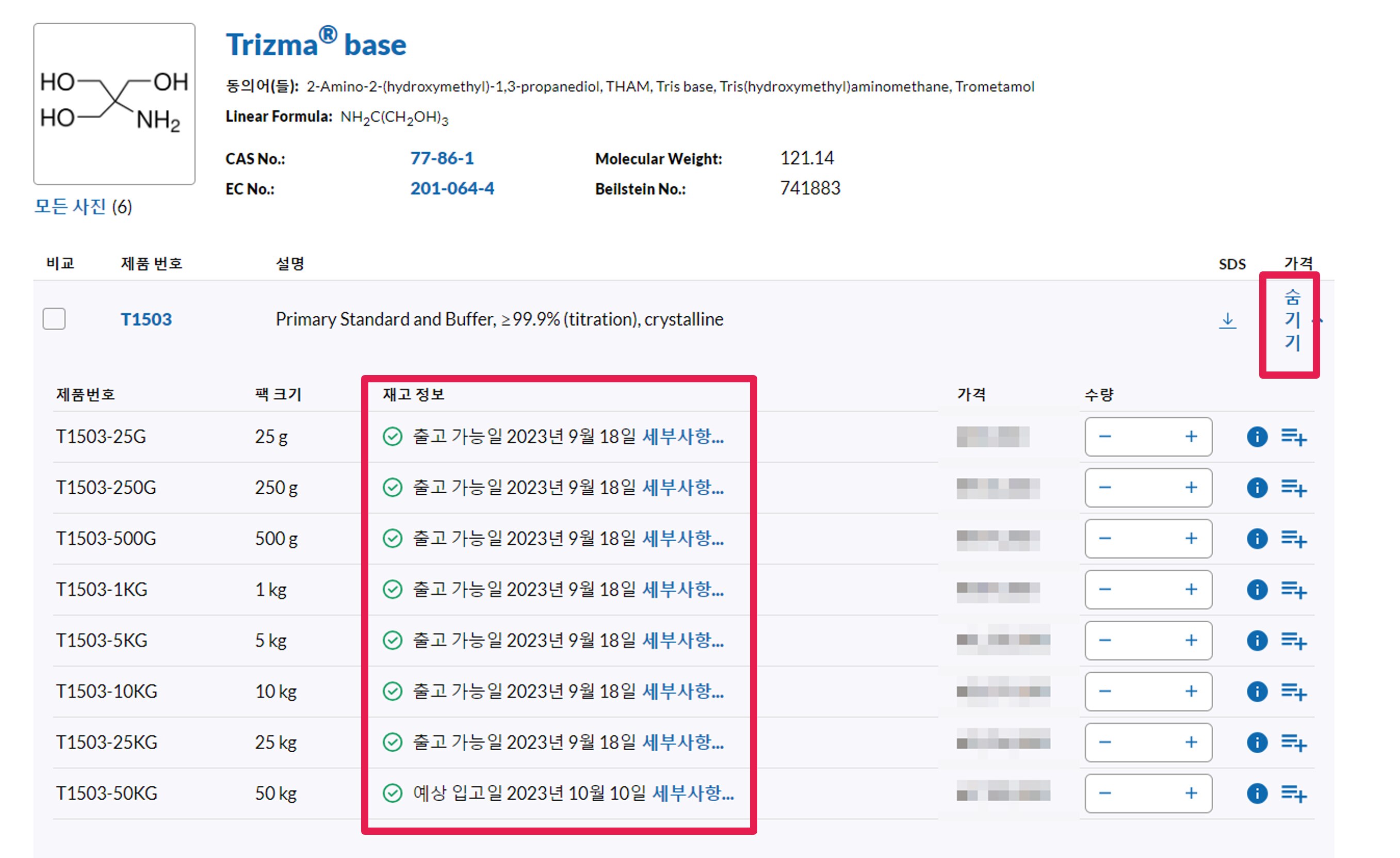 SDS: 안전보건자료(SDS) 검색 항목에 제품 번호를 입력하고 검색을 클릭합니다. COA의 경우와 마찬가지로, pack size는 제외하고 입력하세요 (예: T1503-25G의 경우 용량을 제외하고 T1503만 입력)
