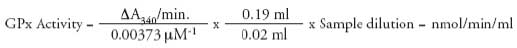 c. Use the following formula to calculate the Glutathione peroxidase activity. The reaction rate at 340 nm can be determined using the NADPH extinction coefficient of 0.00373 µM-1*. One unit is defined as the amount of enzyme that will cause the oxidation of 1.0 nmol of NADPH to NADP+ per minute at 25°C.