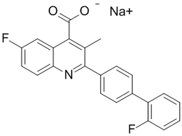 More>> An immunosuppressive and anti-neoplastic agent that inhibits pyrimidine synthesis by blocking the activity of mammalian mitochondrial dihydroorotate dehydrogenase (DHODH; IC₅₀ = 12 nM). Less<<Synonyms: NSC 368390, DuP 785, 6-fluoro-2-(2ʹ-fluoro-1,1ʹ-biphenyl-4-yl)-3-methyl-4-quinoline-carboxylic acid sodium salt
